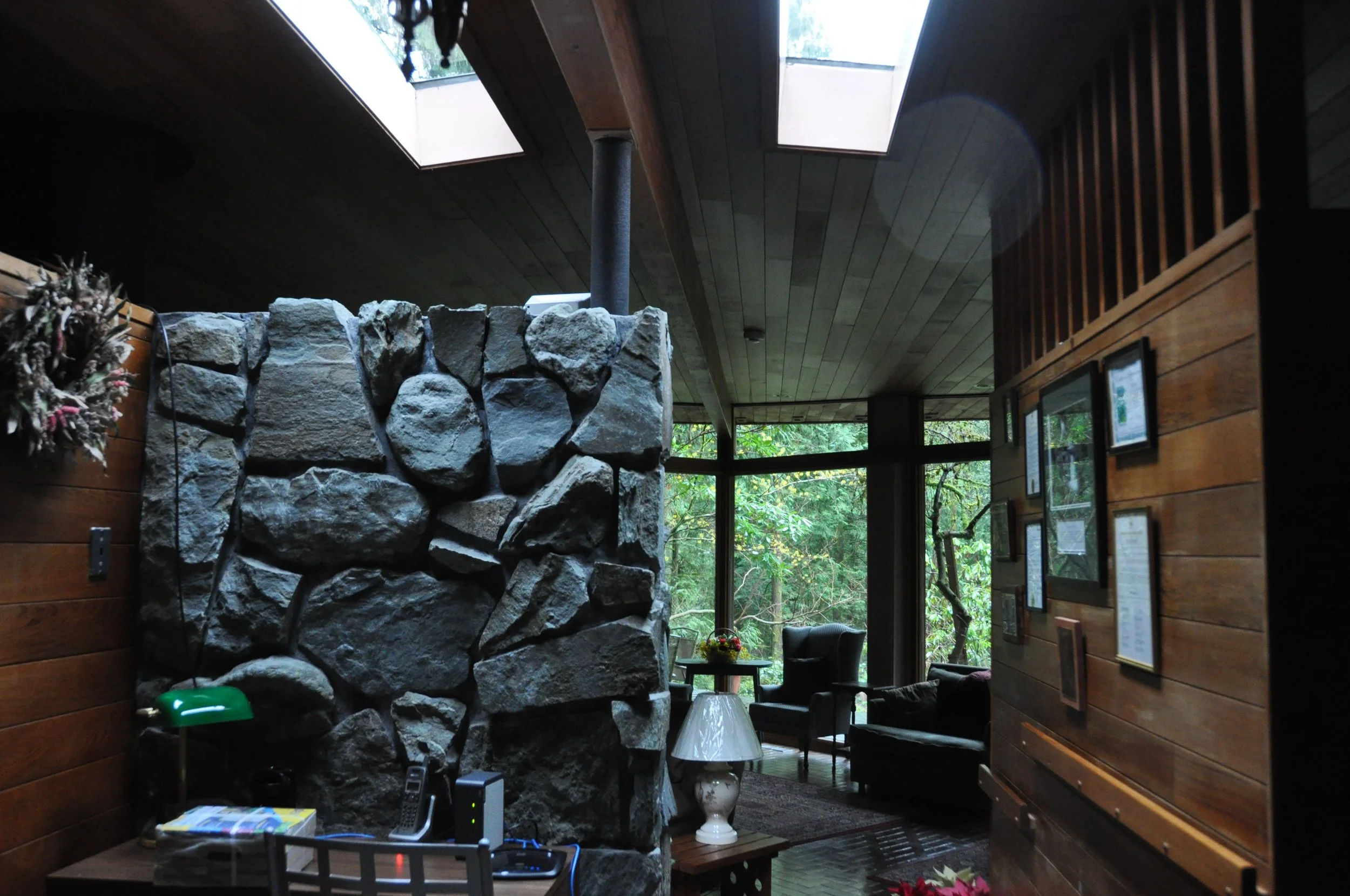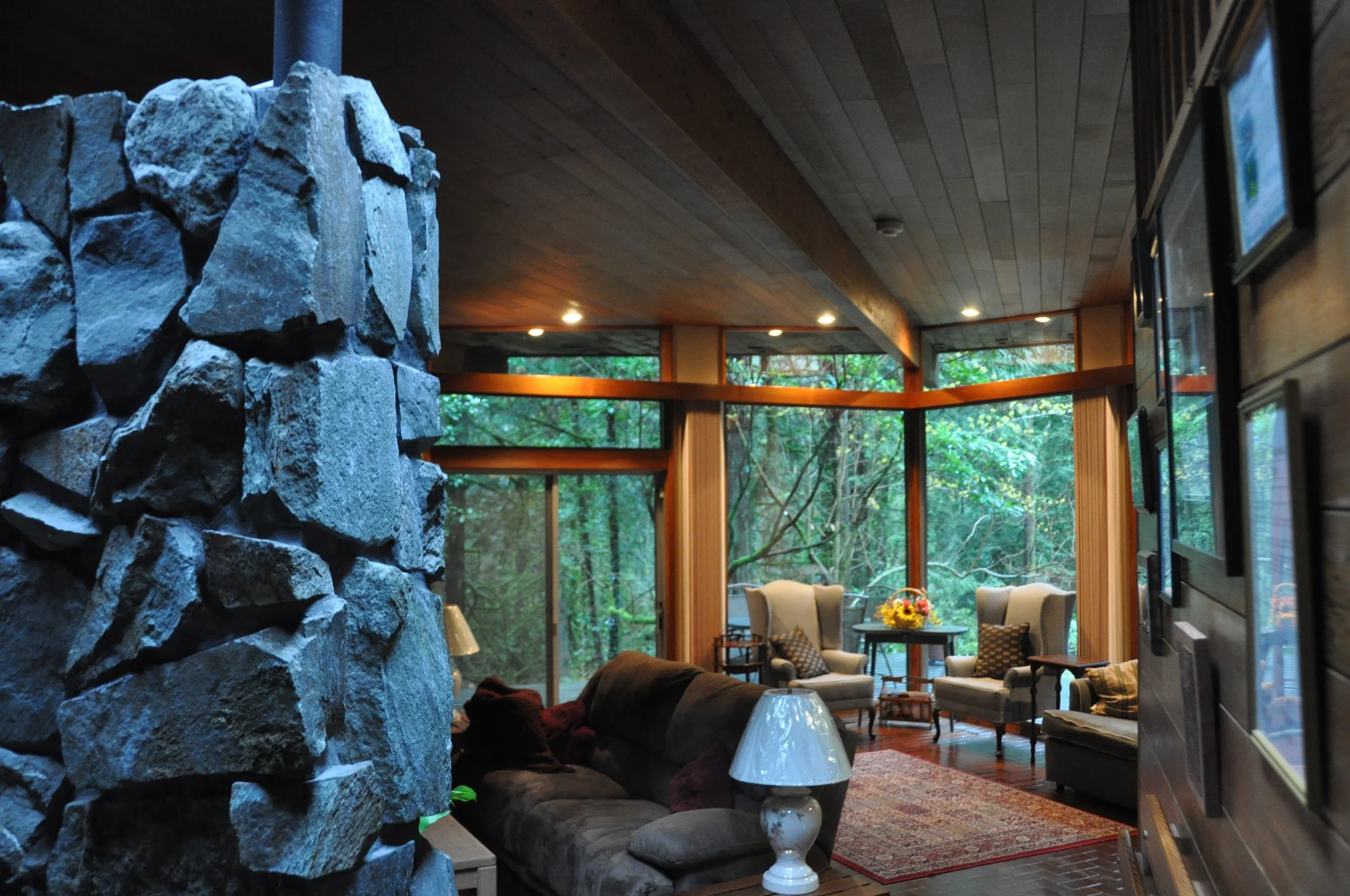 When I purchased the house several years after Ruth passed away, it was essentially abandoned and up for foreclosure. The garden was overrun with vinca and blackberries, there were half dead trees overshadowing the house, the forest had grown up so much the garden plants could barely extend a leaf into the sunlight. The cedar walls needed sanding and oiling, the end block floor had been painted over, and the enormous windows were foggy. The exterior needed careful brushing and sealing with marine oils, and the giant glulams restored with boat building materials. Years of trash buildup from picnicking bears was removed from the forest.