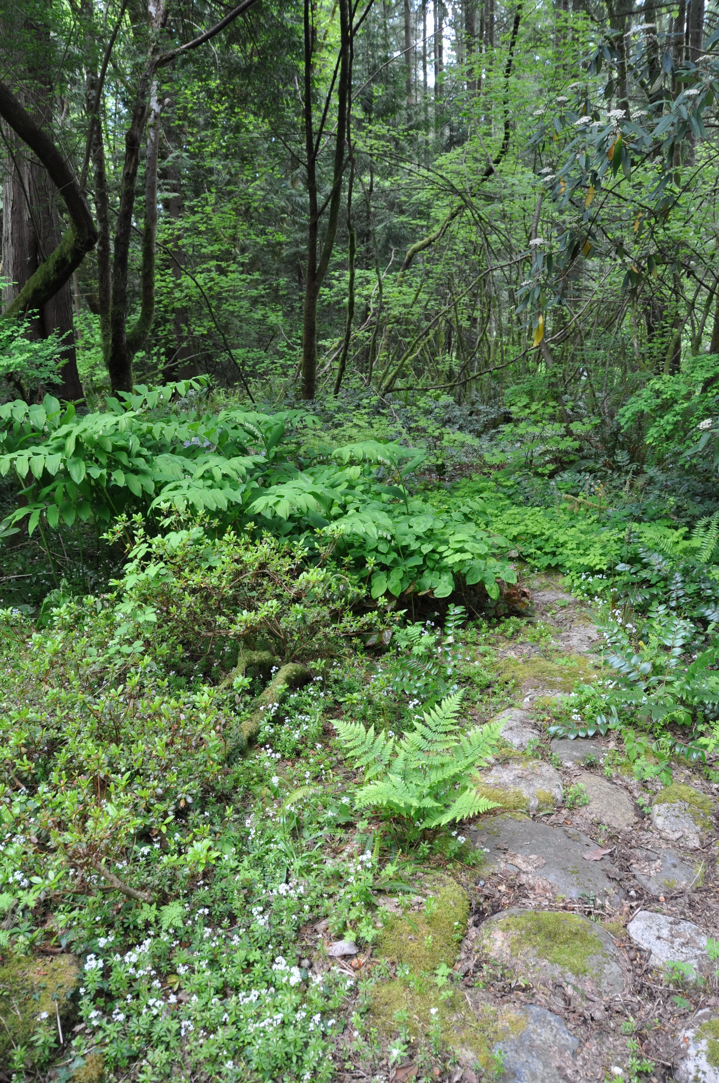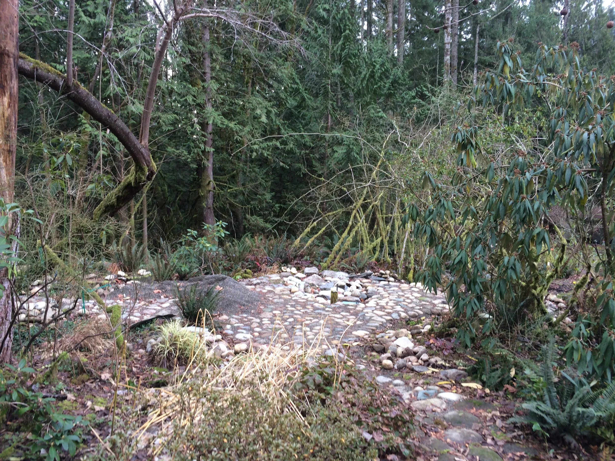 The result was spiritual in beauty, and so inspirational I dedicated the next 13 years to curating it as a sanctuary and work of art. I tripled the plant collection, adding many rare and subtropical species. I expanded the stone terracing with rocks from the property and even locally made bricks. , created garden rooms, and framed views from each section of the property to the others. I brewed compost tea and released beneficial insects every summer. I tarped the old weed pile for 8 years then made a woodland garden of giant ferns, rhodies, and flowering ginger cascading down towards the creek. I identified and labeled the older plants, and tried to replace them with the same species to preserve Ruths palette when they passed away from age.